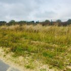 A vibrant watercolor landscape features a golden yellow field under a cloudy sky. Lush greenery borders the field, with distant hills and patches of red adding depth to the serene countryside scene.