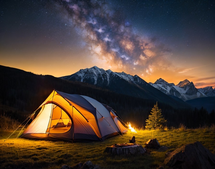 A tent under a starry sky with the Milky Way, campfire glowing, and mountains in the background at night.