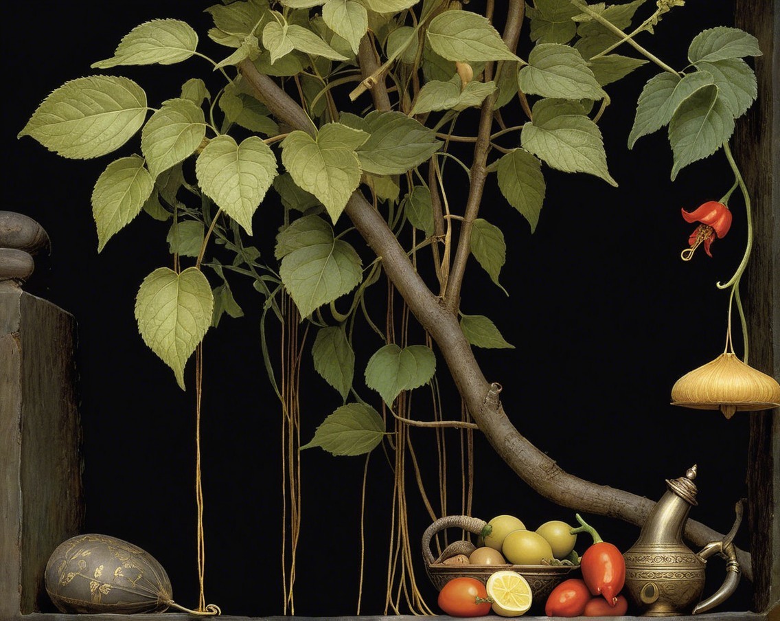 A serene woman in a flowing black robe plays a flute, surrounded by glowing lanterns and ancient vessels. Lush leaves frame the scene, creating a mystical, harmonious atmosphere.