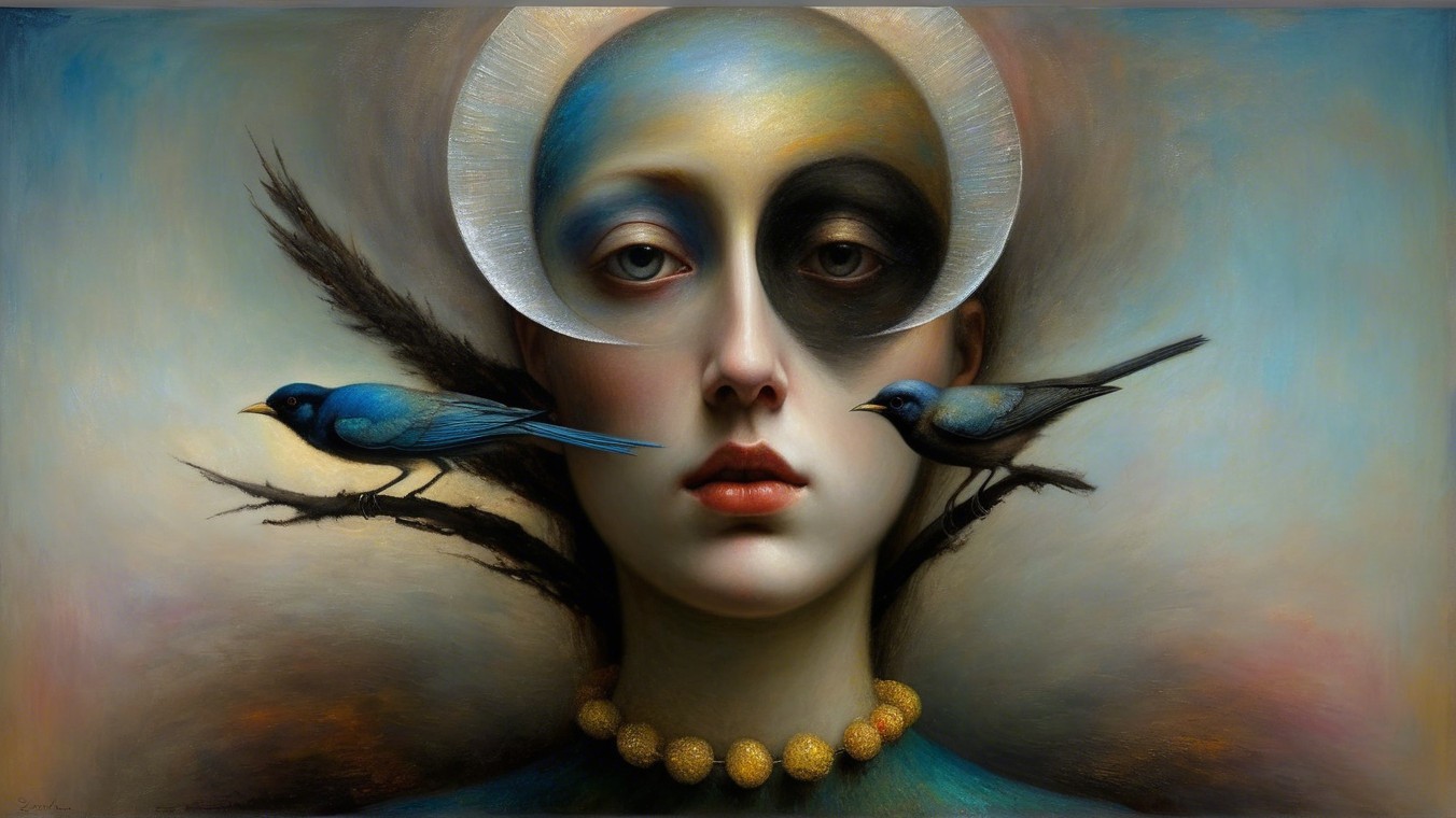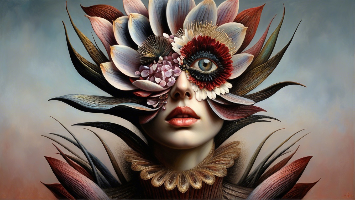The image features a striking portrait of a woman with dramatic makeup, including bold eye shadows and an orange flower in her hair. The background hints at an ethereal, twilight setting.
