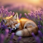 A sleepy fox curls up amidst vibrant lavender flowers, its soft fur glowing in the warm sunlight. The serene scene captures the beauty of nature and peaceful moments.