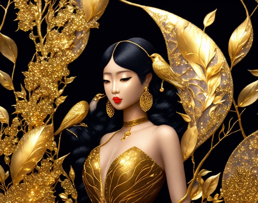 An illustration of a woman with golden attire and ornaments, surrounded by golden foliage and birds against a black background.