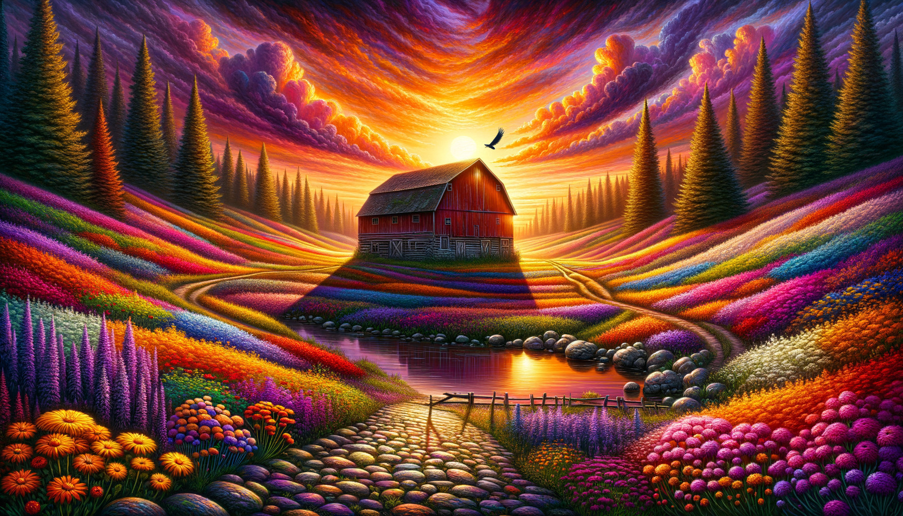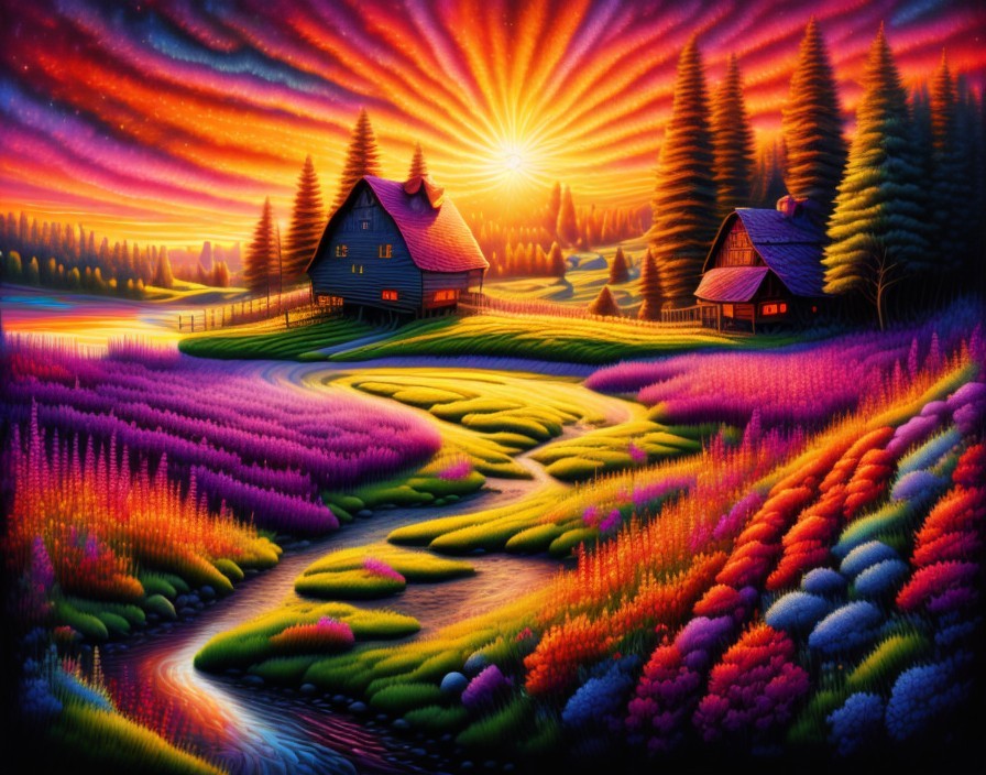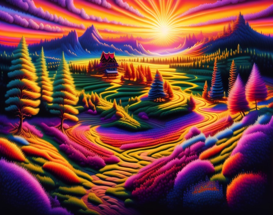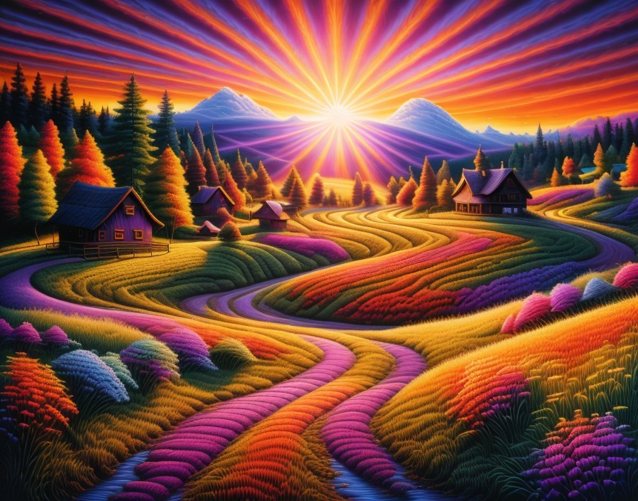 A vibrant artwork featuring a surreal, colorful landscape with flowing hills, a radiant sunset, and two cozy houses nestled in nature.