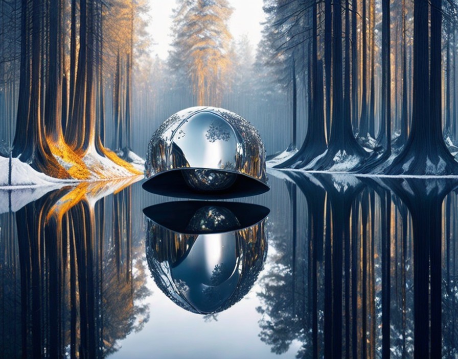 A reflective sphere sits on a tranquil lake amidst snowy woods at twilight, casting a mirror image on the water's surface.