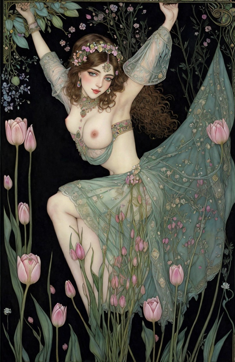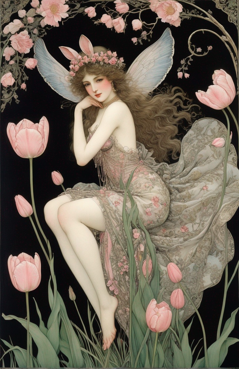 A woman in a flowing gown with pink tulips and an ornate background. She has a floral headpiece and a dreamy expression.