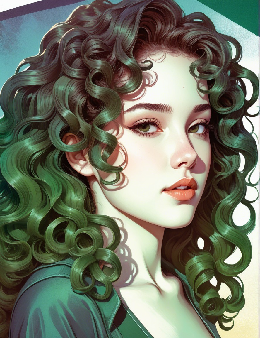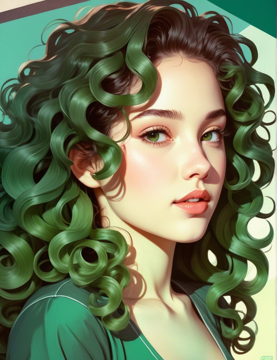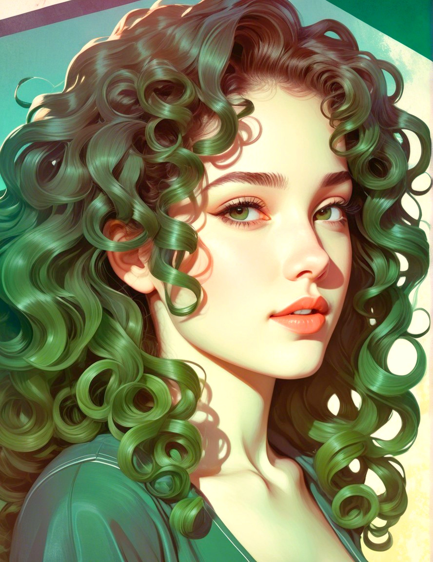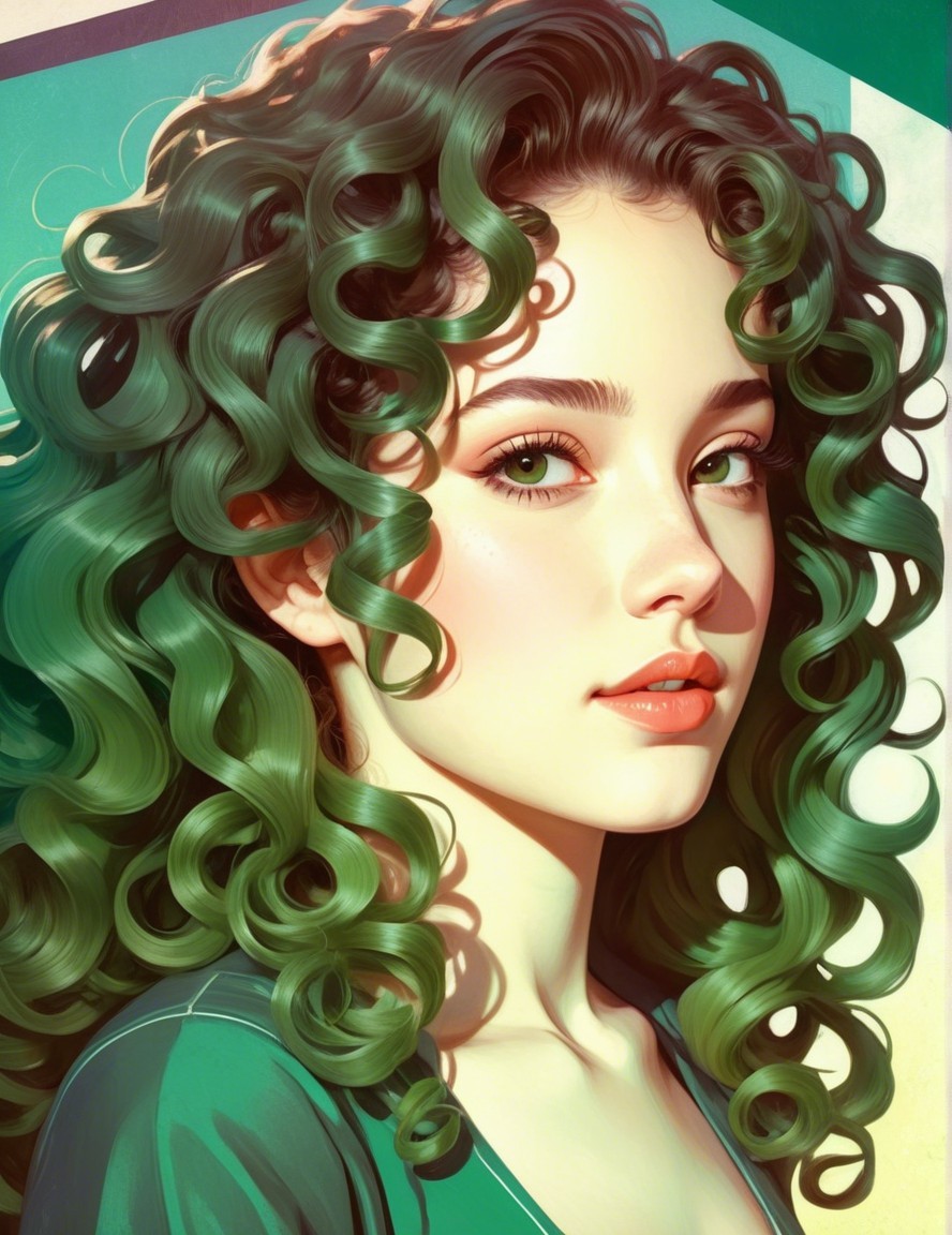 A portrait of a young woman with vibrant, curly green hair and striking green eyes. She has a soft, natural complexion and a serene expression, set against a bright, airy background.