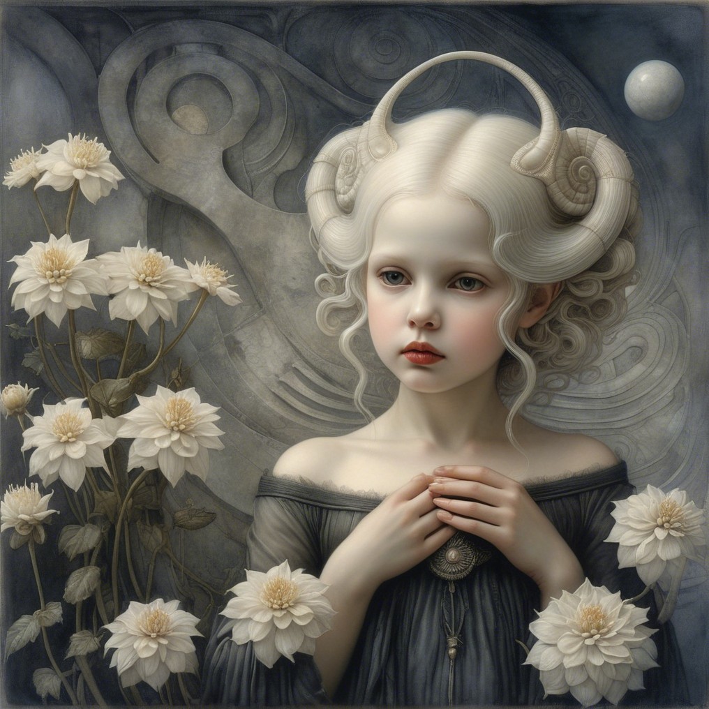 A surreal artwork features a pale girl with elaborate horns, surrounded by ghostly cat-like faces. Her expression is serene amid a backdrop of twisting vines and ethereal architecture.