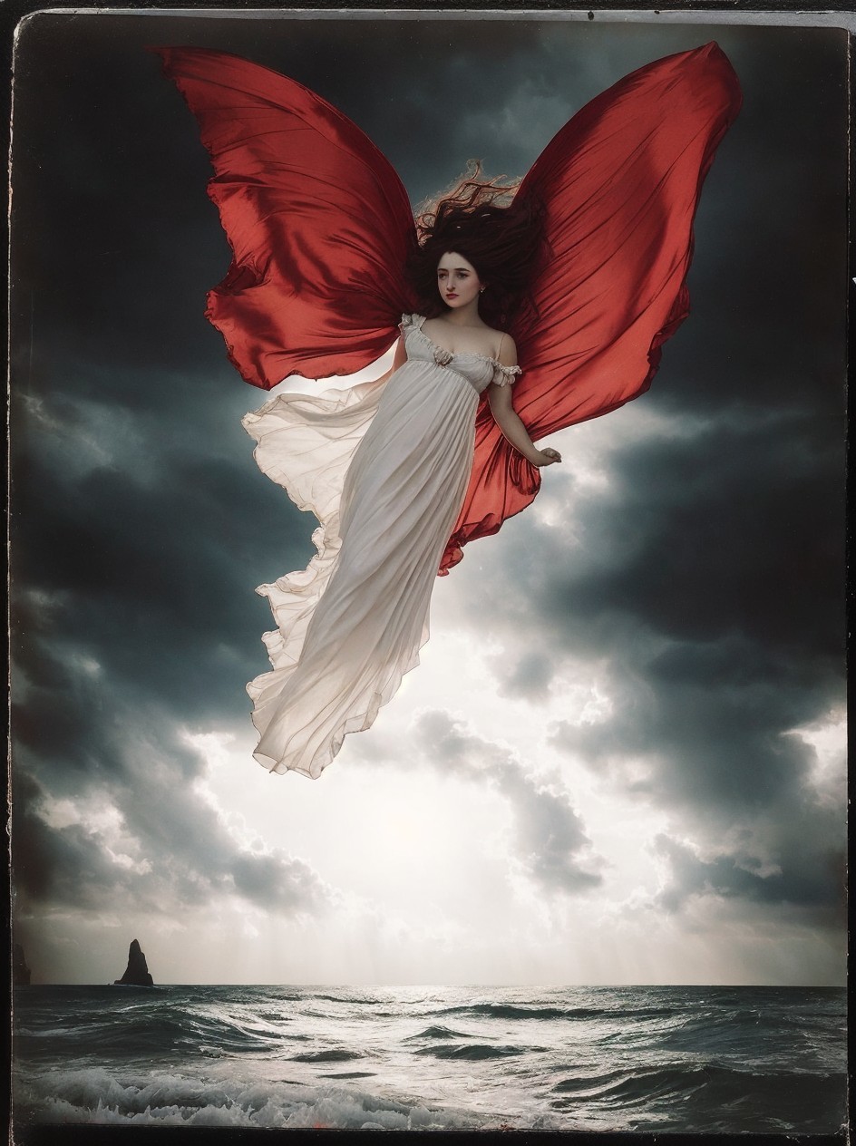 A woman with red wings and a flowing dress hovers ethereally above a tumultuous sea under a dramatic sky.