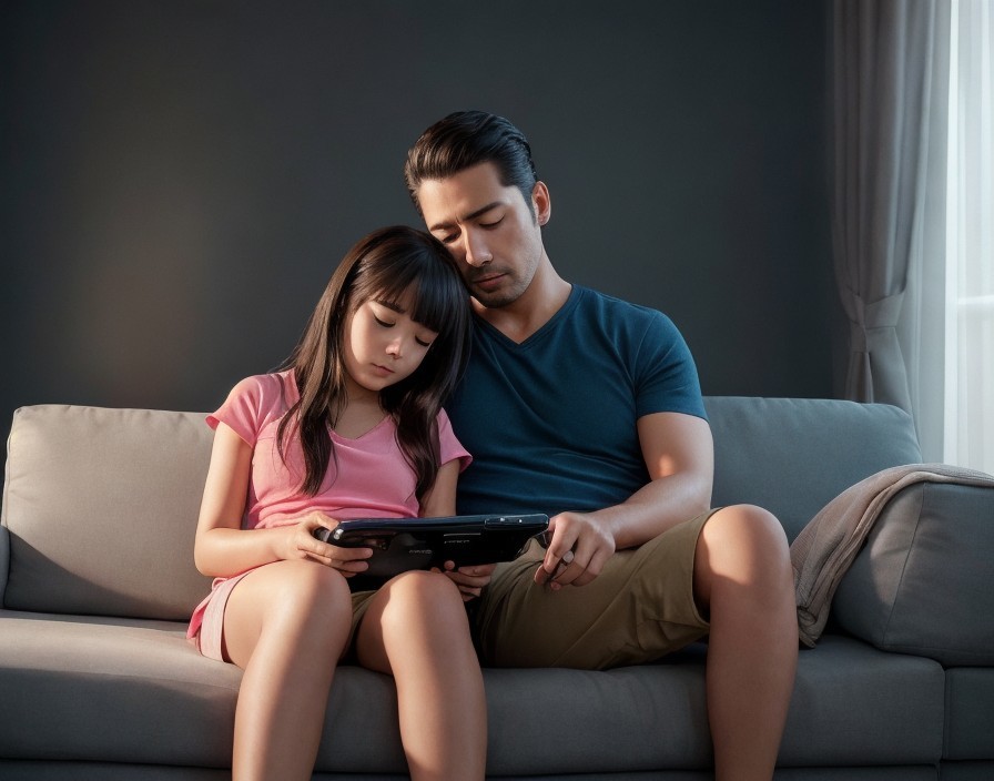 Woman resting head on man's shoulder on sofa in cozy room with dim lighting