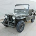 A classic military jeep with a green exterior, adorned with white star decals. It features a soft top, sturdy tires, and an open design, reflecting its vintage utility and rugged charm.