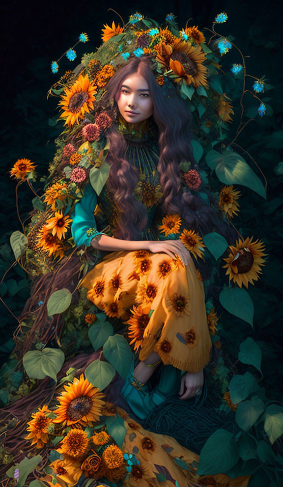 a woman with a mysterious smile and beautiful body sitting next to a bunch of sunflowers, digital art, inspired by james christensen, trending on cg society, fantasy art, photo pinterest, beautiful costume, sculpture of persephone, beautiful deep colours, ocher and turquoise colors, beautiful witch with long hair, wrapped in cables and flowers, painting of beautiful