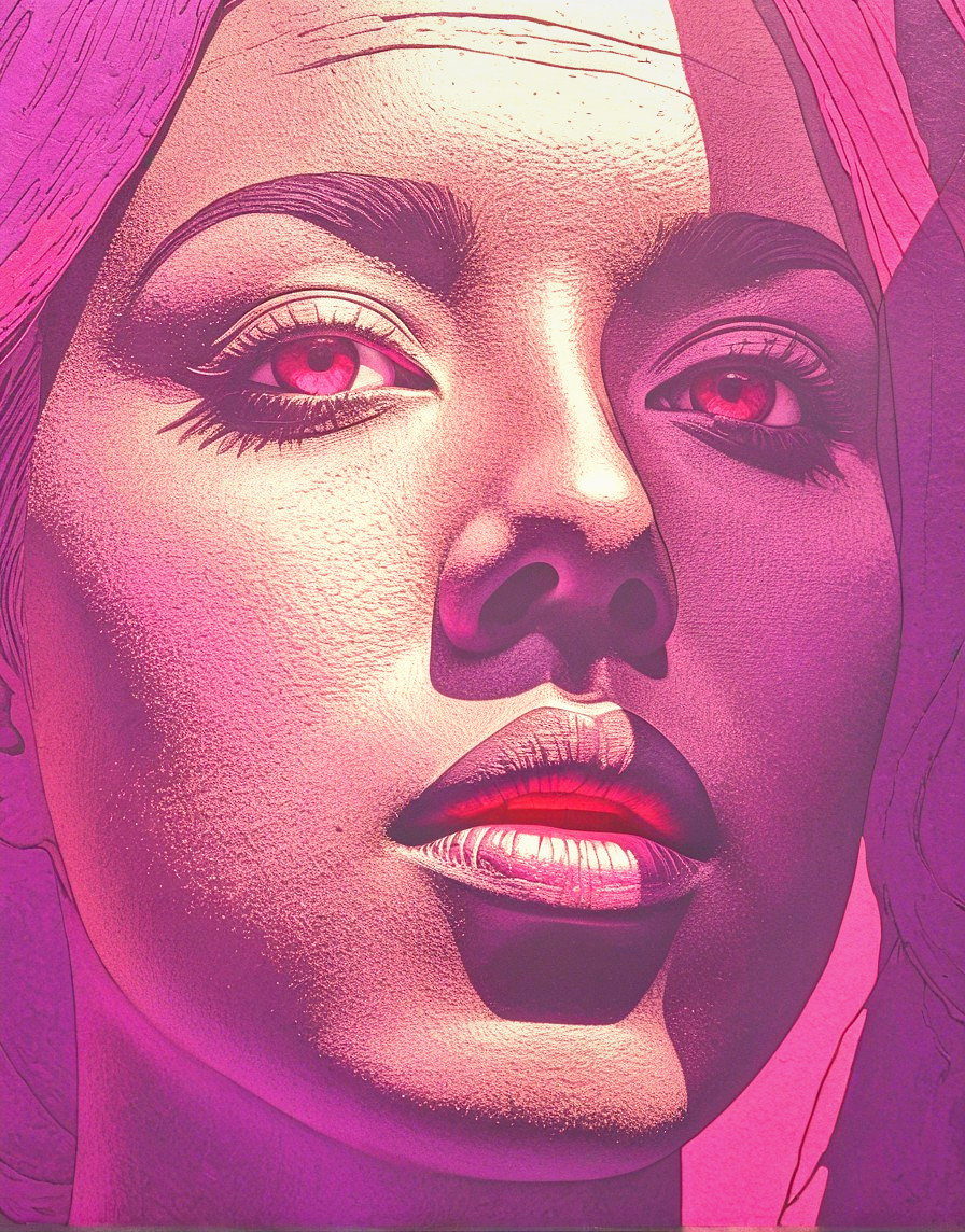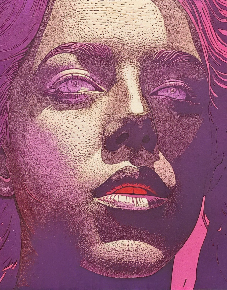 + Prompt:Stylized woodblock print, collagraphy, close up, headshot, contouring outlines, tetradic color scheme light-purple dark-red rosewood-pink, transpositional invisible aperture, fill backlighting, highly detailed, cel-shaded, brightness 1.3, back-lit, hdr, hypermaximalist, by David Lynch and Renny Tait, hinting at cosmic mysteries. Delicate merging with visible carvings and Luminism, mixed media style. Inspired by Man Ray, Ho Baron and Renny Tait. Old paper texture, 128K, crisp quality, Maximum detail, Maximalism, surrealism, defined brush strokes, textured background, acidic neo noir, triadic color scheme goldenrut-yellow baby-blue sea-green, alcohol ink wash, watercolor and ink elements, dynamic pose, enlightened background with vivid gradient inking colors, patchwork, stylized, fantastical essence, luminal soft parametric light and shade extension, impossible light transitions, glowing, floating, shimmering, quilling, transpositional invisible aperture, fill backlighting, highly detailed environment blending organic and geometric shapes. Inspired by the styles of Storm Thorgerson and Renny Tait and Man Ray, reminiscent of psychedelic postimpressionism by Nadya Rusheva and Man Ray and Walter Molino
