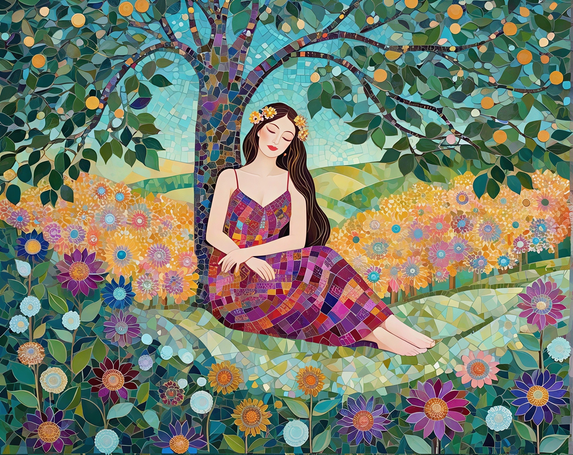A beautiful mosaic painting depicting a woman sitting peacefully under a tree in a field of colorful flowers. The woman has long dark hair and is wearing a colorful sundress. She has flowers in her hair and her eyes are closed, suggesting she is meditating or resting.