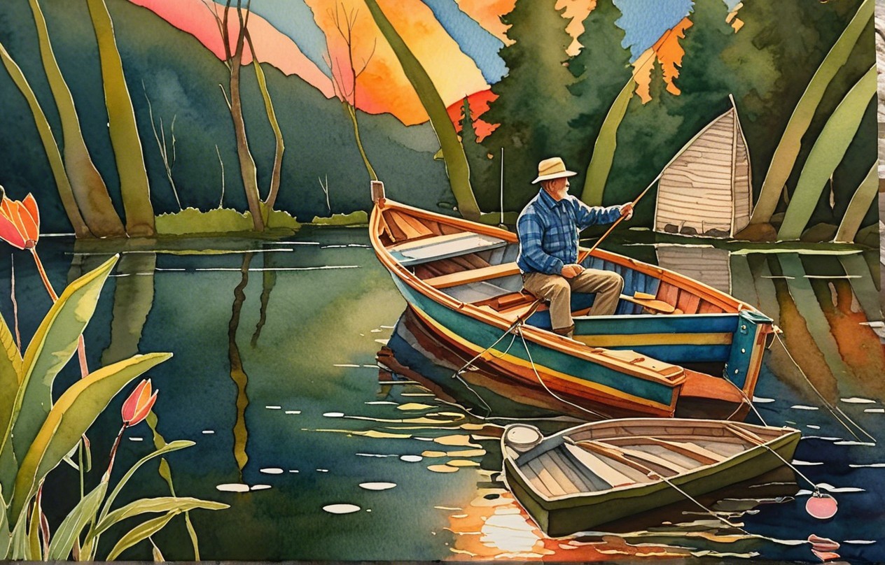A serene watercolor scene depicts a man fishing from a small boat on a tranquil lake, surrounded by lush trees and mountains, with a cozy cabin reflecting in the water at sunset.