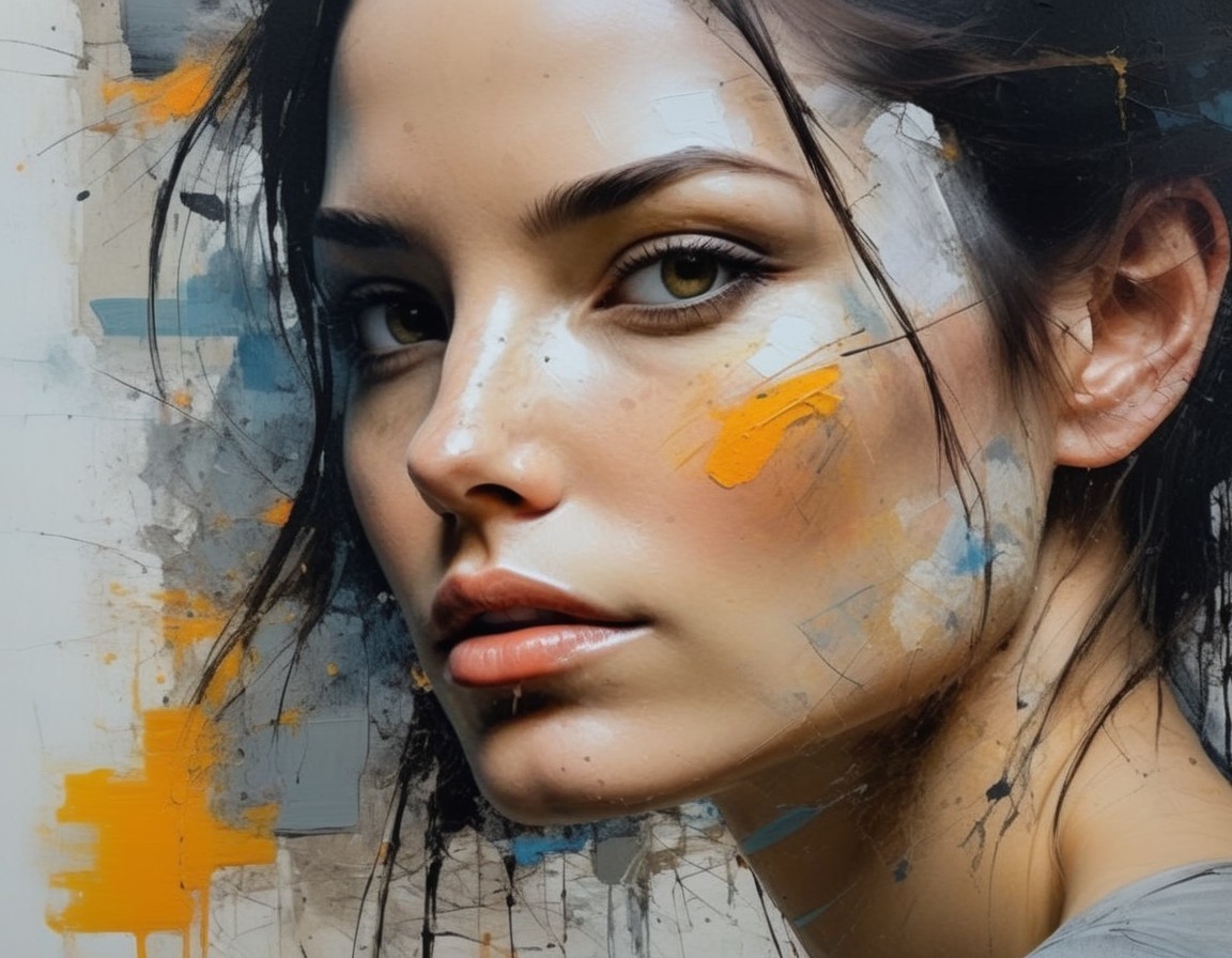 Prompt: Woman, perfect facial features, Minimalist, line art combined with loose sketching, visible brushstrokes, expressive brushstrokes, oil on canvas, abstract