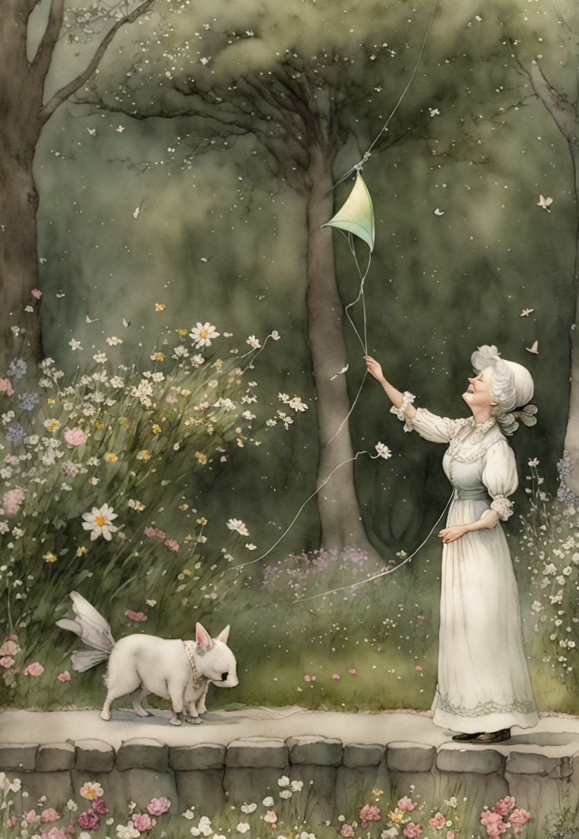 A woman in a flowing white dress joyfully flies a colorful kite in a lush garden, accompanied by a cheerful white dog. Butterflies flutter among blooming flowers under a serene forest backdrop.