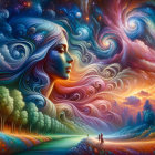A surreal landscape features a woman’s face merging with vibrant clouds and cosmic elements. Below, a couple strolls along a serene river, surrounded by colorful nature and a breathtaking sky.
