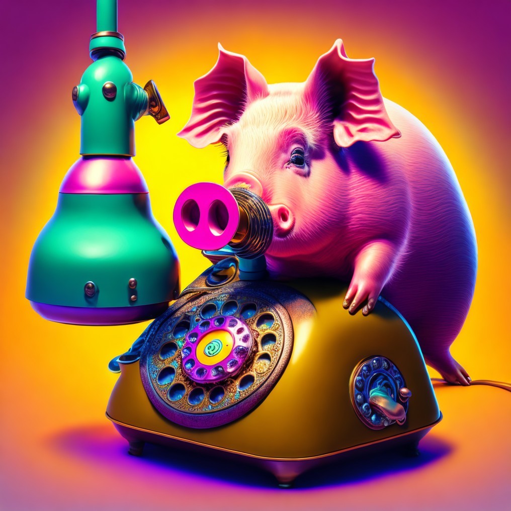 A colorful illustration of a pig with a telephone receiver to its ear, against a vibrant purple and yellow background.