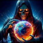 A mysterious figure cloaked in dark robes holds a glowing orb surrounded by flames. The skeletal face adds an eerie touch, contrasting with the dramatic sunset backdrop. A scene filled with mystical energy.
