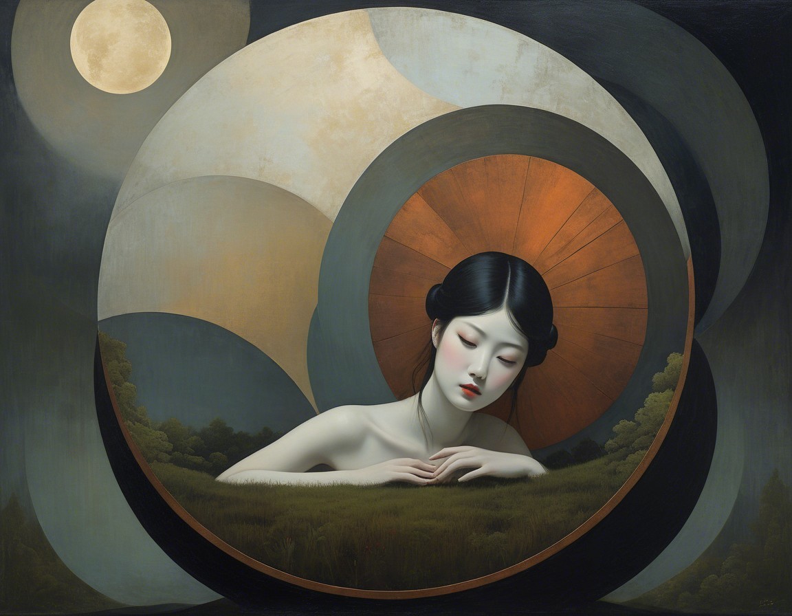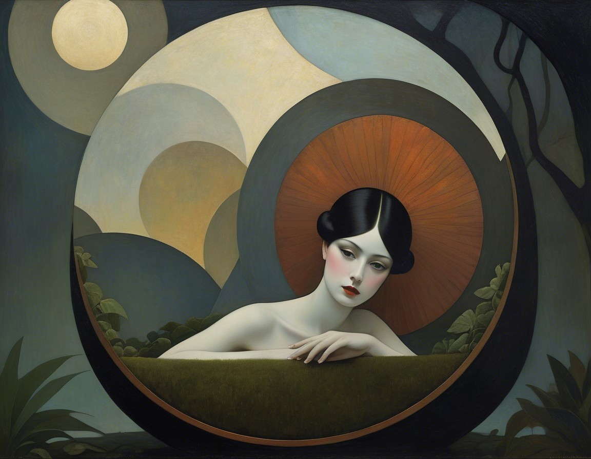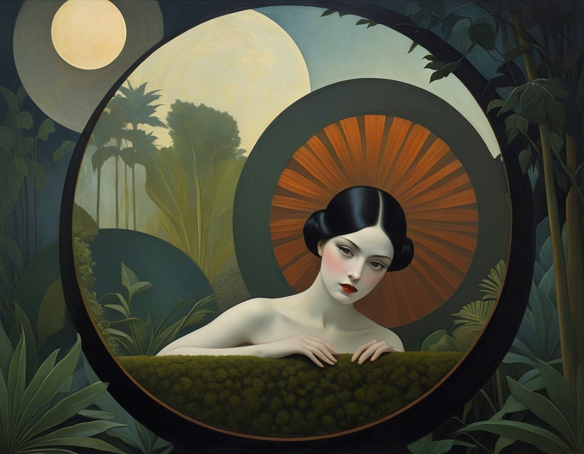 A serene woman with dark hair peeks from lush greenery, framed by a circular border. The backdrop features crescent moons and vibrant foliage, creating a mystical, tranquil atmosphere.