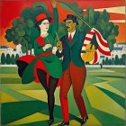 A stylish couple from a bygone era stands confidently against a dramatic red backdrop. The woman, in a green blouse and flowing skirt, holds a stick, while the man, dapper in a suit and hat, carries a suitcase.