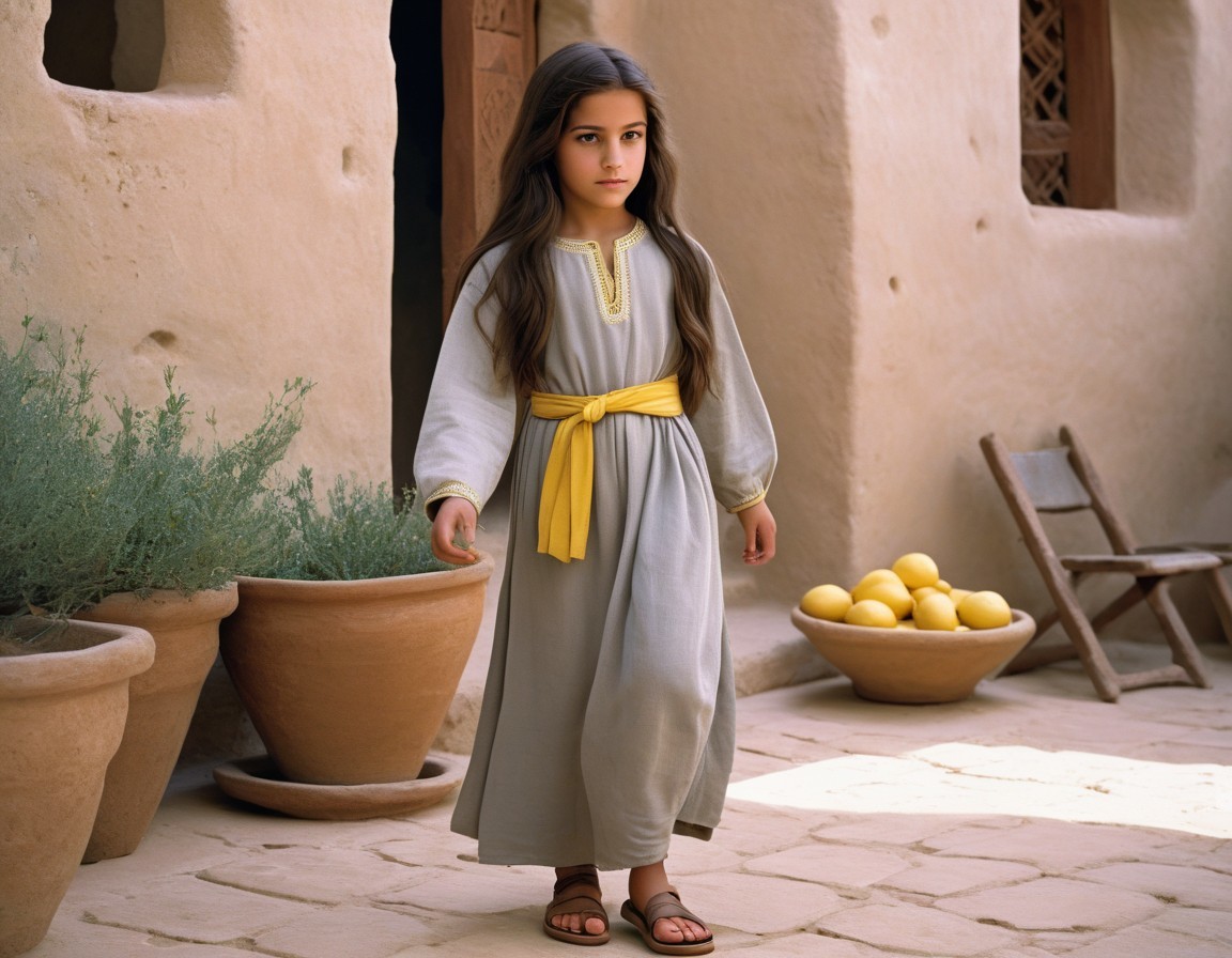 She is dressed in a dove-grey, ankle-length tunic with long sleeves, a lemon-yellow sash and leather sandals.