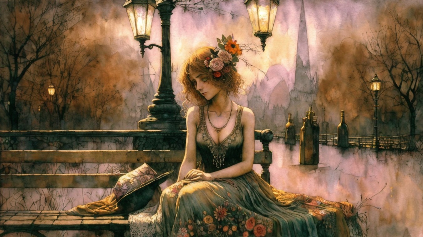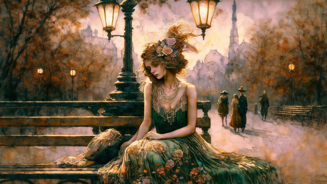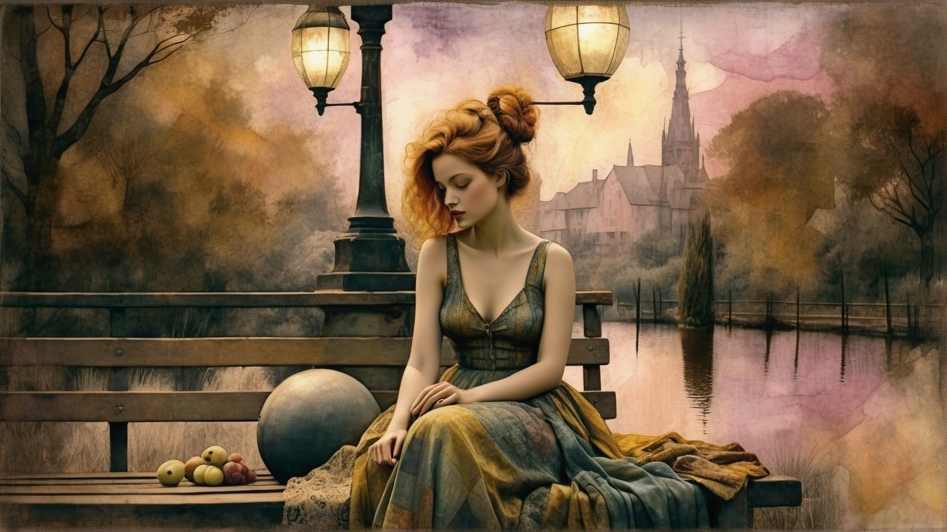 A serene woman in a flowing gown sits by a tranquil lake at sunset, with glowing lanterns illuminating her. A grand church and lush trees reflect the peaceful ambiance.