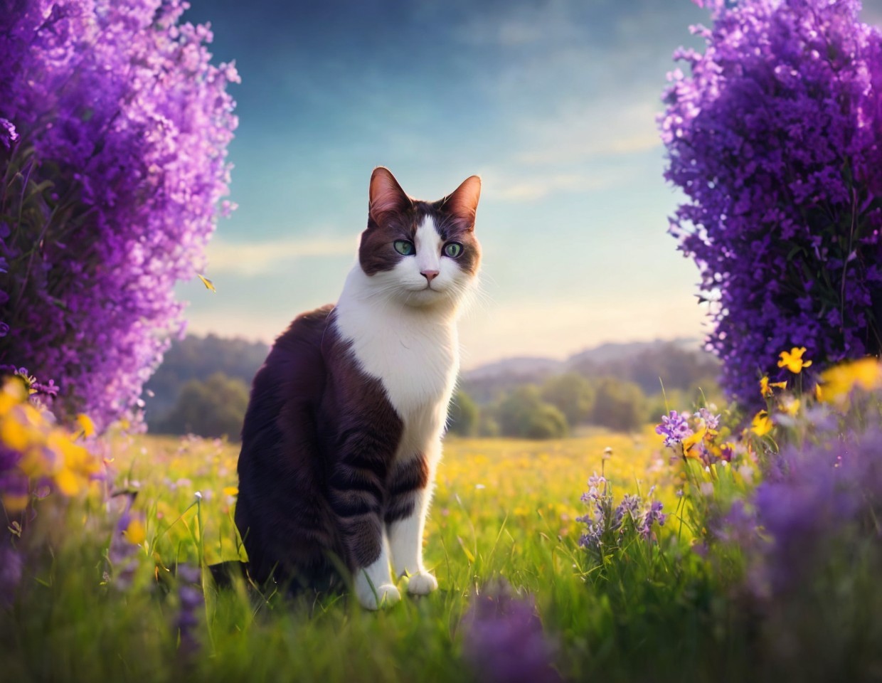 Prompt: 126895;1[Photoreal cat in meadow looking into the distance, purple flowers]{intricate 8k beautiful dynamic lighting ultra detailed Unreal Engine cinematic postprocessing pencil sketch Gustave Doré Arthur Rackham deep color Edmund Dulac body parts forced accurate and proportional anatomical accuracy metallic sparkling Golden highlights}[A hyper-realistic depiction of a magical Illustration captured in a photorealistic style, with incredible details and vivid colors {artwork features whimsical designs reminiscent of art by Irina Ponomareva, Sveta Shubina, and Filipe K. This artwork is a masterpiece that emulates refined art and crisp quality definition}]