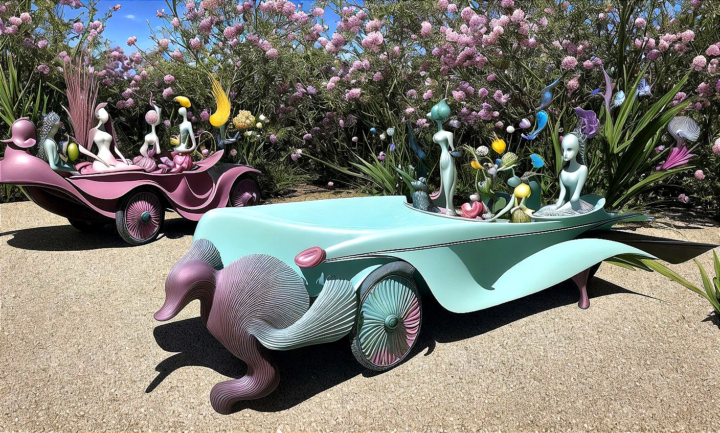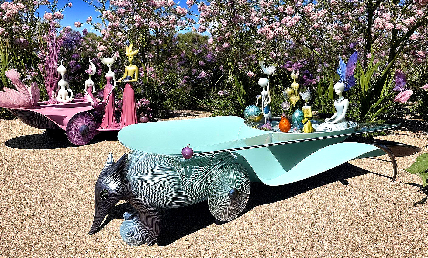 Whimsical garden sculpture with human figures, fish-shaped boat, purple trees, blue sky