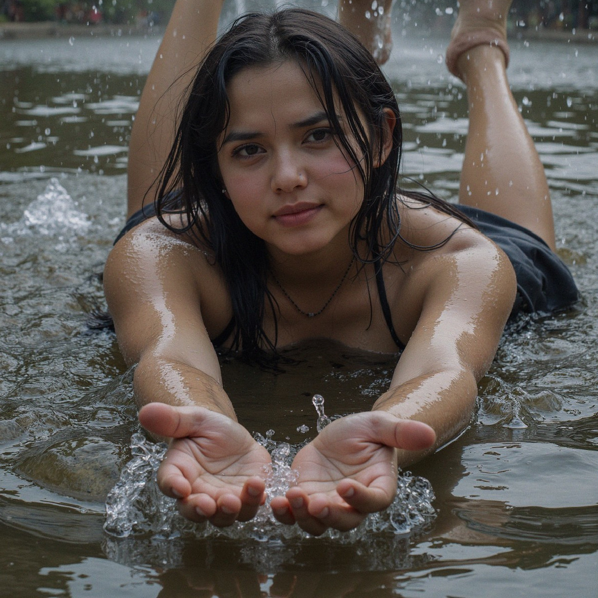 A woman with wet hair enjoying the water, her expression joyful as she splashes playfully. The image features a soft sepia tone, enhancing its natural and candid feel.