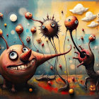 A whimsical, surreal scene featuring bizarre creatures with exaggerated features and playful expressions, set against a colorful backdrop of clouds, moons, and abstract elements.