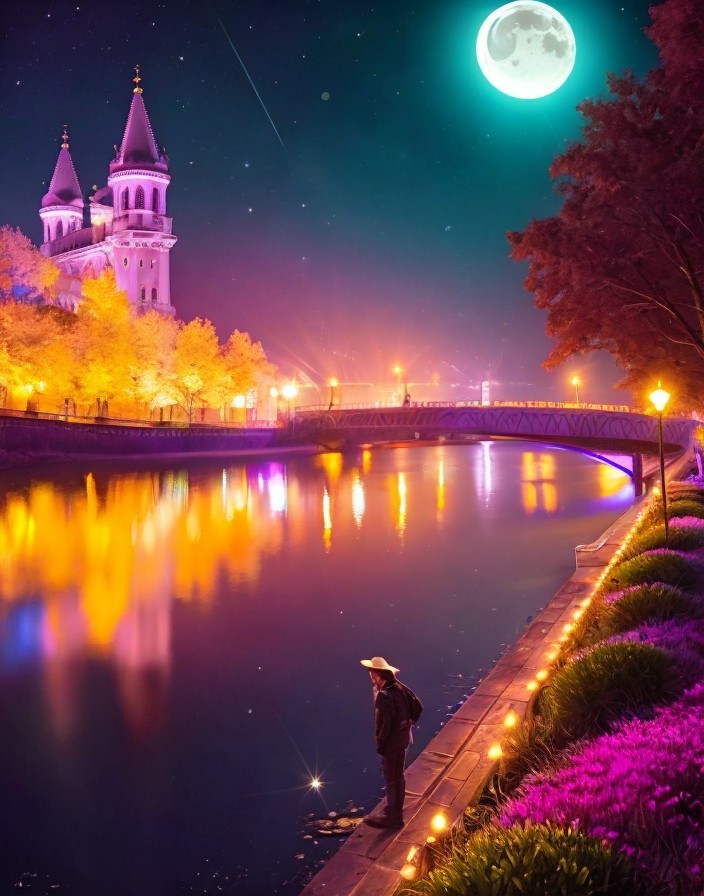 Prompt: "An illustration of a night so clear a crescent moon winks back at you, picture a scene on the embankment of a small river where a brujo is looking for the psychedelic mushrooms which glow and sing, he has found a cluster of the mushrooms and there is a look of joyful success on his face, the embankment and forest comes to life in vivid neon colors and there small reptiles and other animals that look on in reverie"