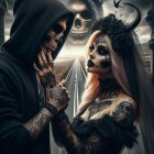 Two women in striking makeup, one with a skull design, wear shiny silver hoods. They hold a colorful lollipop, set against a moody, atmospheric background of nature.