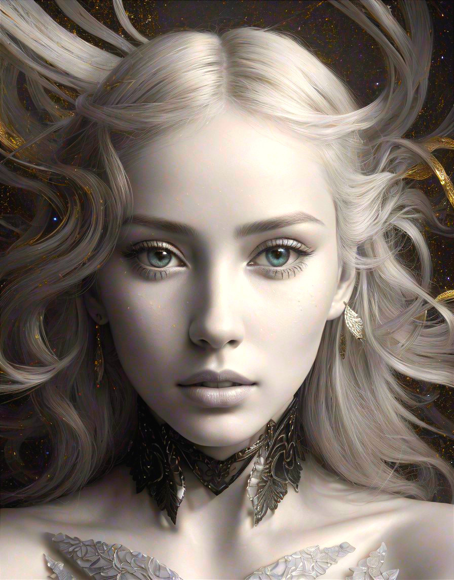 A portrait of a fair-haired woman with striking eyes, ornate golden accessories, and detailed lace attire.