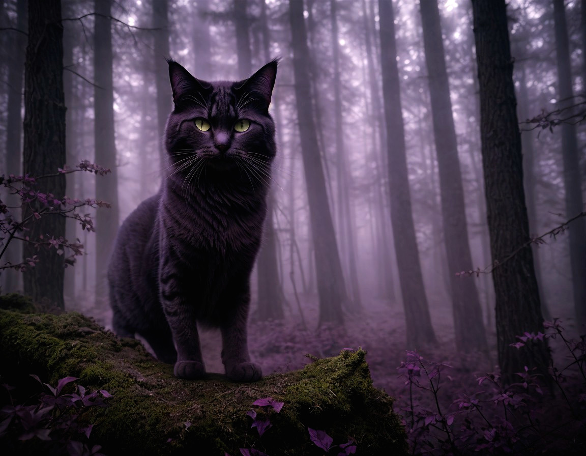 A majestic black cat sits confidently on a moss-covered log in a misty forest. The ethereal purple hues of the fog and trees create a mystical, enchanting atmosphere.