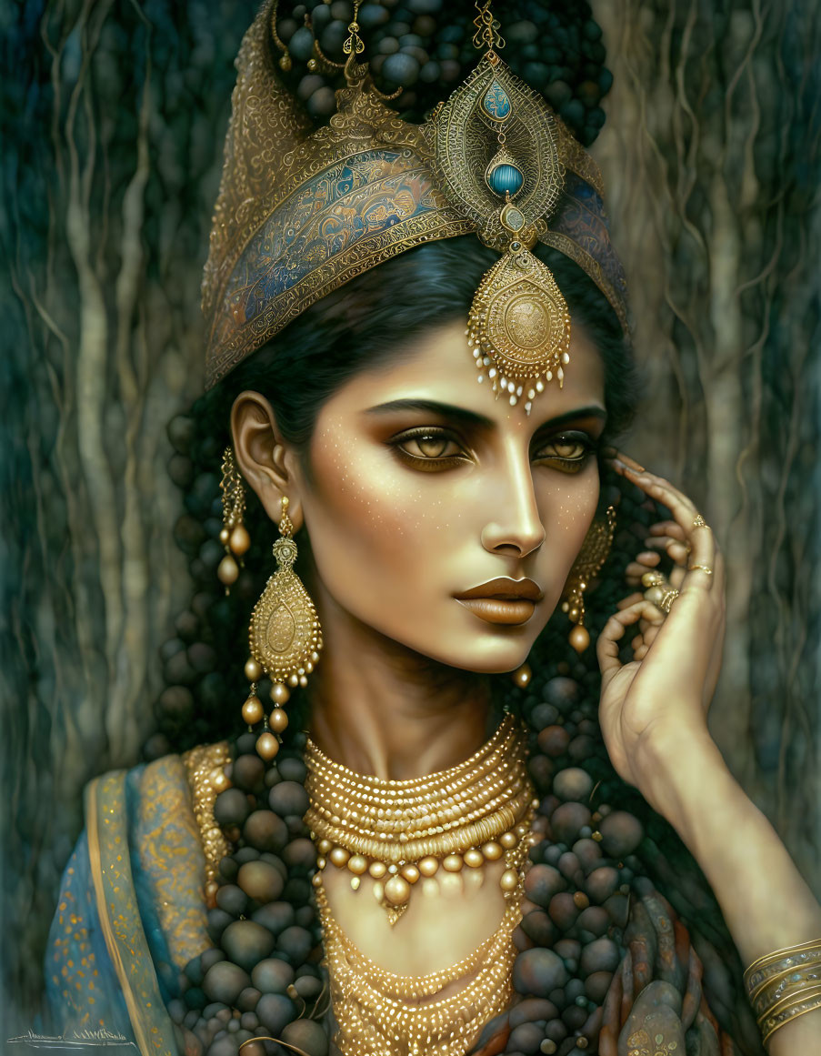 Detailed portrait of a woman in traditional attire and jewelry against dark background