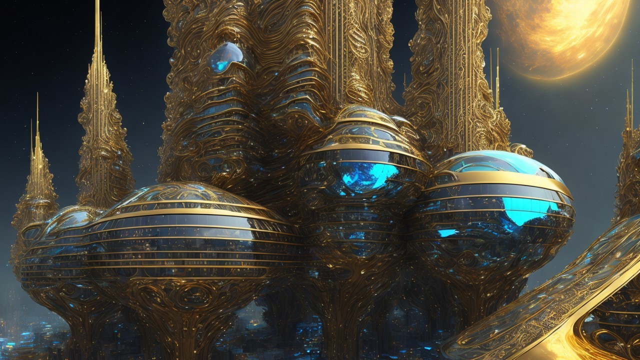 A futuristic cityscape with intricate, golden structures resembling organic forms. Reflective surfaces and swirling patterns create a sense of depth and surreal beauty, set against a dark background.