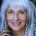 A young woman with short, curly silver hair and striking green eyes smiles warmly. Her makeup is subtle, enhancing her natural beauty, set against a lush green background.