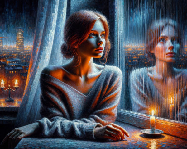The scene opens with a wide stretch of the Seine, its waters glistening under a soft autumn sun. The reflections of golden-yellow and amber leaves shimmer on the surface, brought to life through thick Impasto strokes that give the water a textured, tactile quality. Along the riverbank, a young couple walks hand-in-hand, their coats layered with thick dabs of paint, adding a sense of warmth and protection from the crisp, cool air. The man’s hat, detailed with sharp strokes using a Palette Knife, catches the wind, while the woman's scarf billows gently, rendered with soft, smooth brushwork to convey its lightness. Fallen leaves, scattered around their feet, are depicted with precise, jagged Palette Knife strokes, making each leaf stand out distinctly in burnt oranges and deep reds. Midground: A cobblestone path meanders along the river’s edge, where benches sit beneath bare, towering trees. The branches are painted with sharp, deliberate Palette Knife lines, giving them a stark, almost skeletal presence against the soft glow of the river. The benches, with their chipped paint and worn wood, are captured in thick, deliberate Impasto layers, highlighting their age and the passage of time. A bicycle leans casually against one bench, its frame painted in broad, smooth strokes to contrast with the roughness of the autumn surroundings. Background: