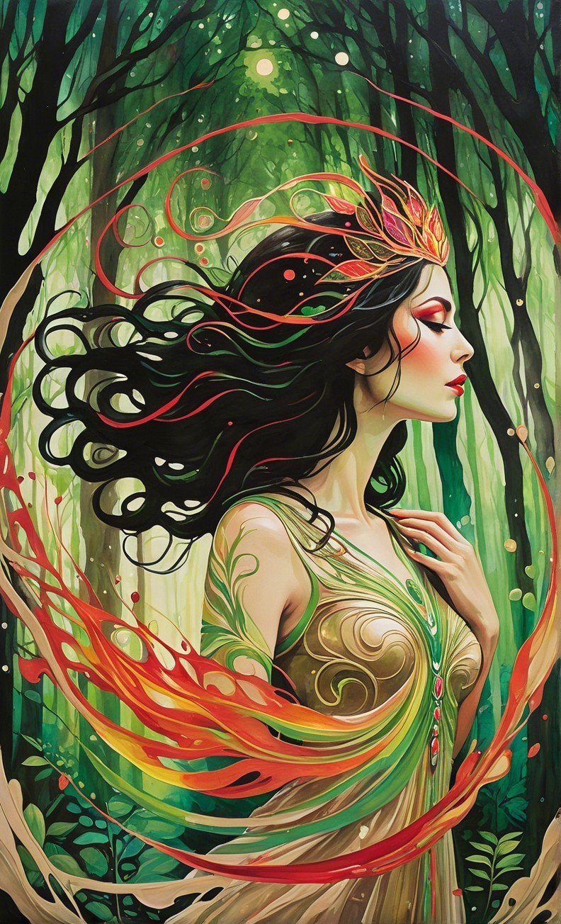 Prompt: Surreal wet-on-wet painting with intricate linework, portraying an enchantress in a vibrant forest using ink and wash techniques. Create swirling skies and a luminous atmosphere with a triadic color scheme of beige, red, and green to evoke emotional depth. Enhance the image with a light pensive moment, plasma flares, and spiritual surrealism, stylized by Paul Kidby. Precise Gelsculpt 64K, novelty architecture, VFX-inspired, uhd, hdr, anisotropic filtering 1.7, octane render, Incorporate shiny shellwork, portrait scenery, stacked lines, elements reminiscent of Marvel Comics in a heartpunk 1.9 style.background is blurred and dark in a painterly manner, high contrast, dynamic lighting enhances the dramatic mood. Style reminiscent of paul kidby's expressive brushwork, romantic, Pre-Raphaelite, capturing kinetic energy, hyperdetailed dynamic lighting, impasto, anatomically correct, perfect facial structure, visible textures, elegant, fantasy patchwork and tessellated plasticity, inspired by American Gothic. Incorporate fractalization techniques and splash ink in a burnt orange, saturated color palette with opalescent touches. Depict a sunset autumn forest with filigree detailed elements, merging boho aesthetics. Infuse the artwork with a psychedelic psychopomp scene, featuring a dethereal touch by Frank Frazetta, with occult undertones and beautiful flares akin to ho baron. Include translucent details inspired by Odilon Redon, emphasizing delicate coloring and a stylized natural background. Blend intricate space-age style with subtle eroticism, focusing on sculpted, cel-shaded, and contouring outlines for anatomical perfection. Set the scene in a surreal forest with textured trees reminiscent of Frank McCarthy, cinematic bokeh lights in background