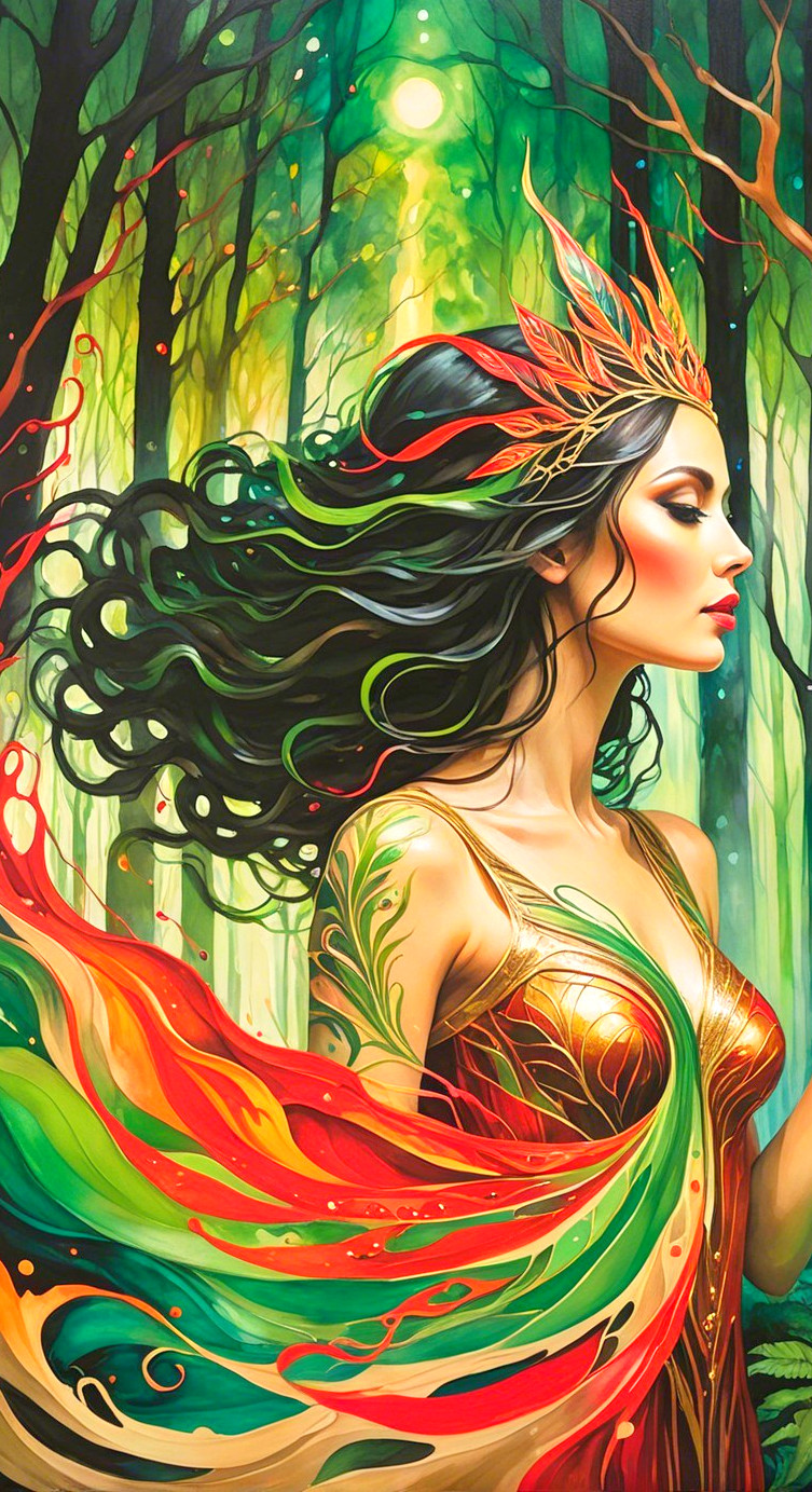 A mystical woman stands in a vibrant forest, adorned with a crown of leaves. Her flowing, colorful gown and striking features exude an enchanting connection to nature.