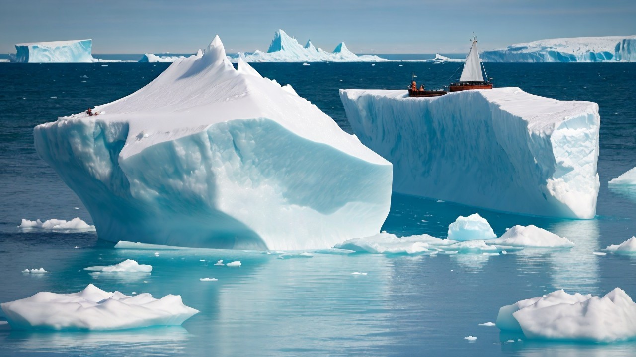 The image features two large icebergs floating in a serene ocean, with a small boat atop one iceberg, surrounded by scattered ice chunks and a clear blue sky in the background.