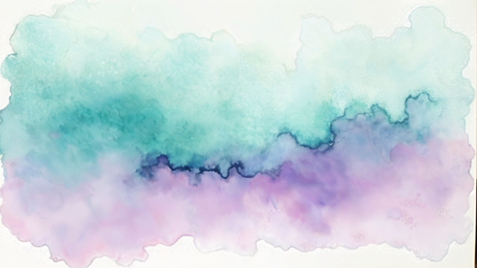 A serene watercolor landscape featuring layered mountains in shades of teal and purple, with soft clouds and a large sun rising above, evoking a tranquil morning atmosphere.
