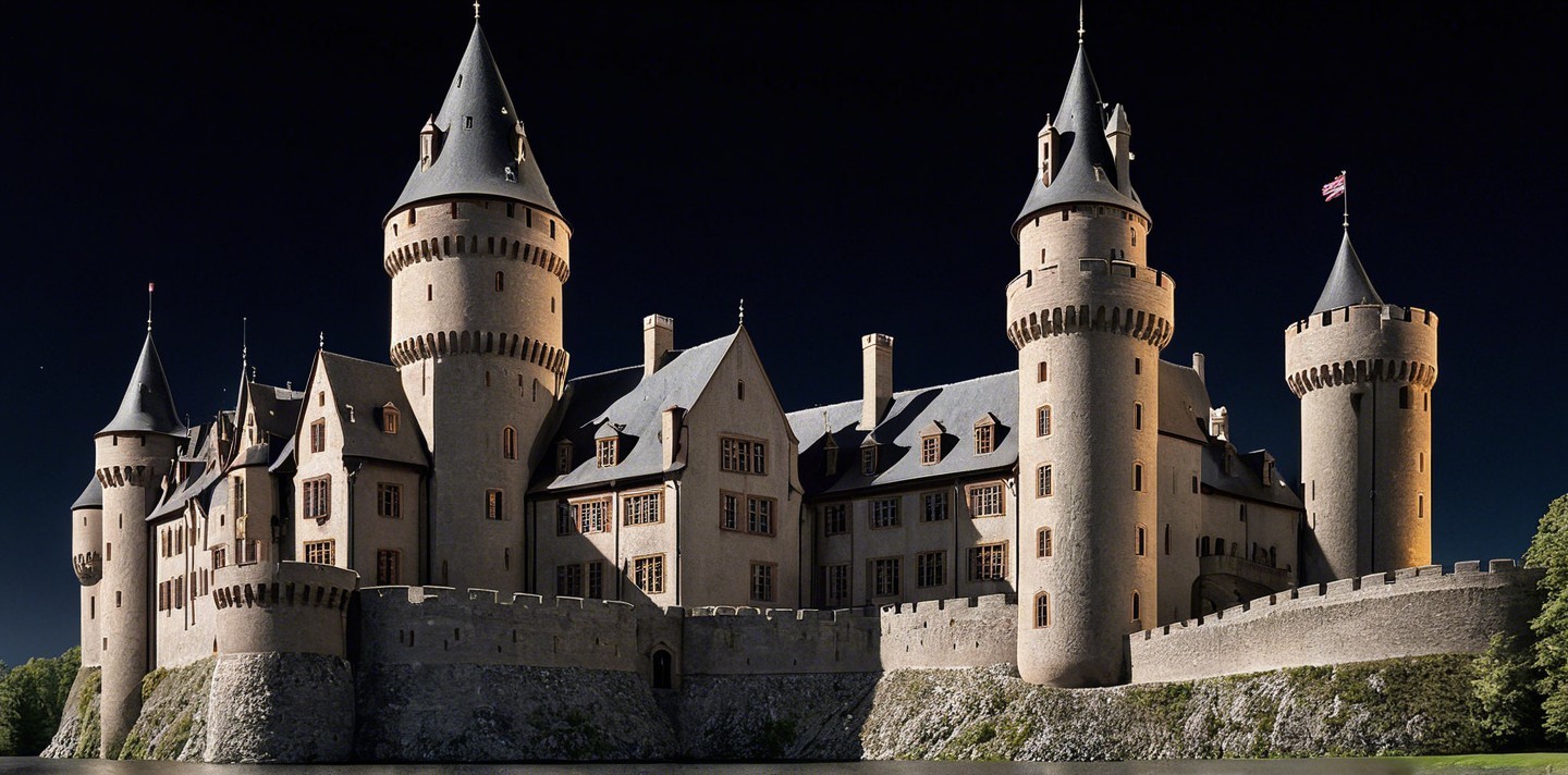 A majestic medieval castle towers over rocky terrain, with tall spires and stone walls illuminated by warm light. The moon casts a soft glow, enhancing its enchanting, fairy-tale atmosphere.