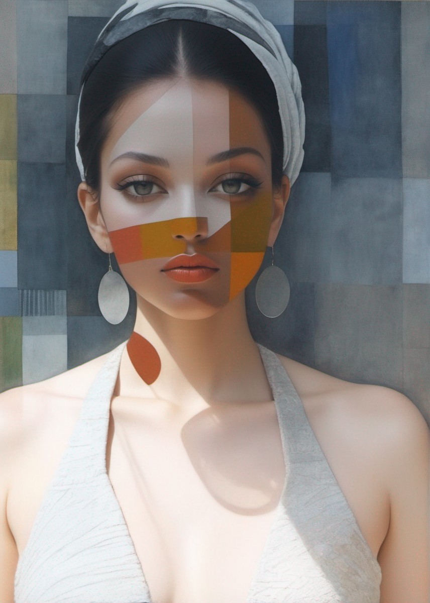+ Prompt:gorgeous portrait of a beautiful woman . “Aboriginal Textile Patchwork By Enki Bilal & Paul Klee & Jennifer Lommers & Hans Hartung & Meghan Duncanson & Mark Rothko & Dee Nickerson & Victor Brauner & Didier Lourenço & ∞ black white shadess of grays,hyper sublime eclectic designs & patterns,