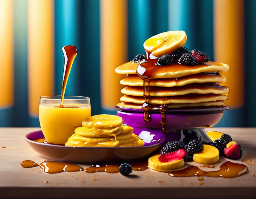 Fluffy pancakes with butter, syrup, and berries on purple plate with orange juice.