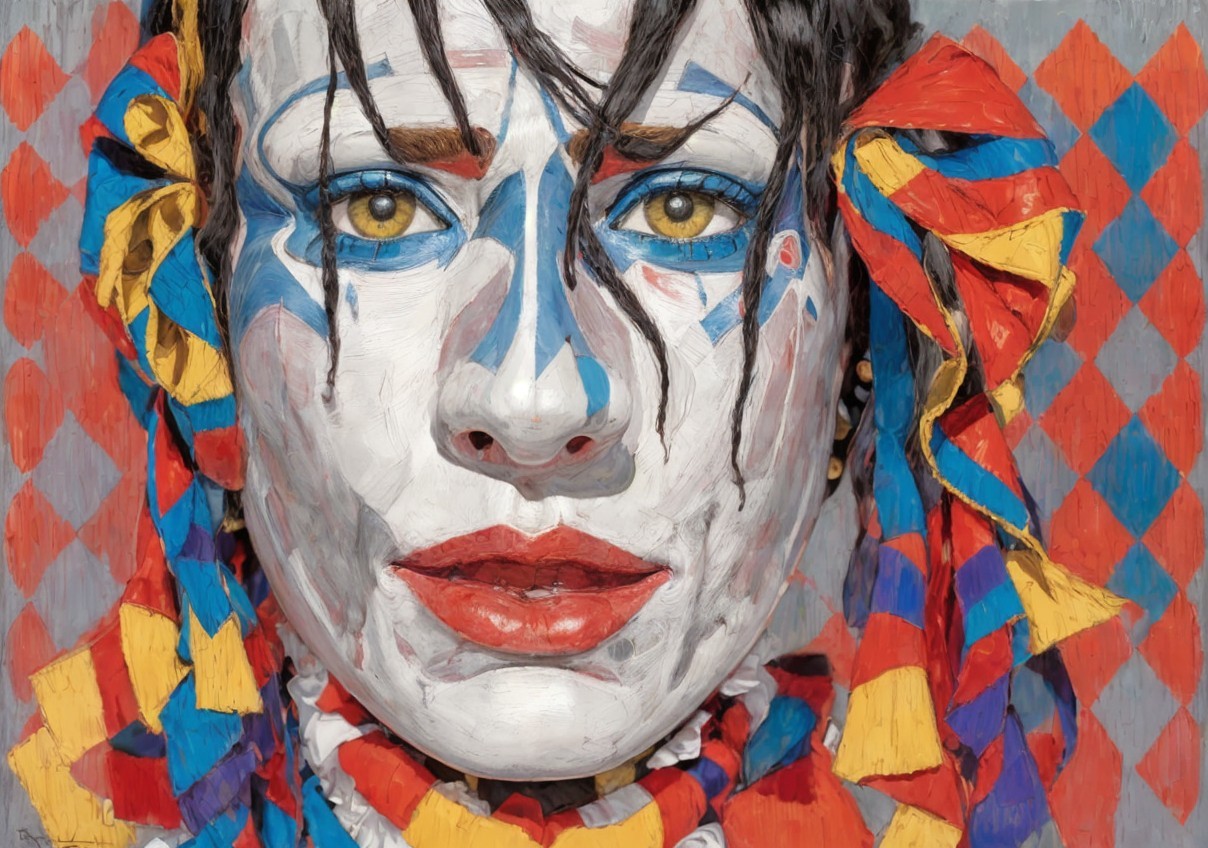 Harlequin mask, stressed, exhausted, crying, screaming, splintering, trapped, excited look, dark eyes, casts shadows, with blue rippling ribbons, ropes