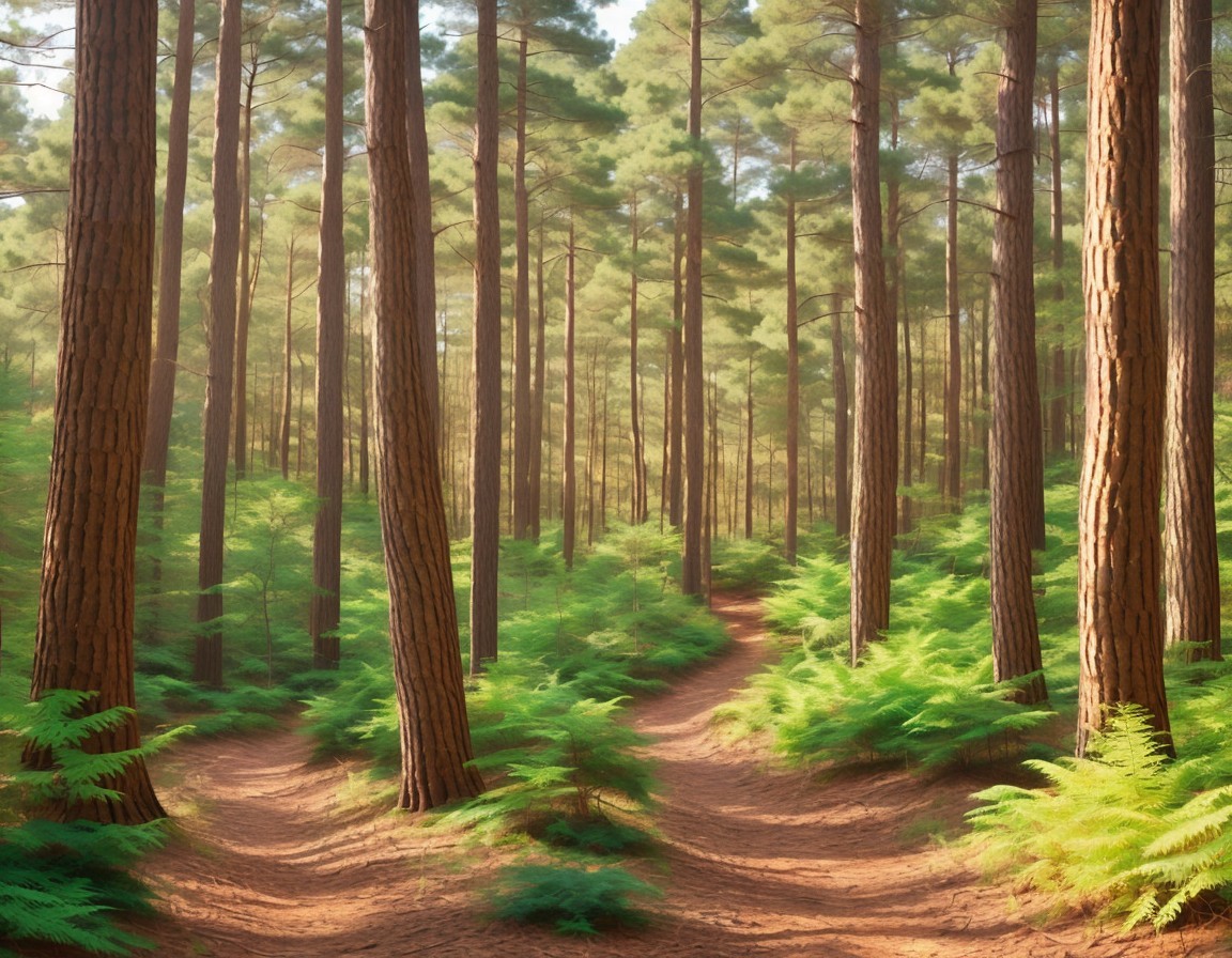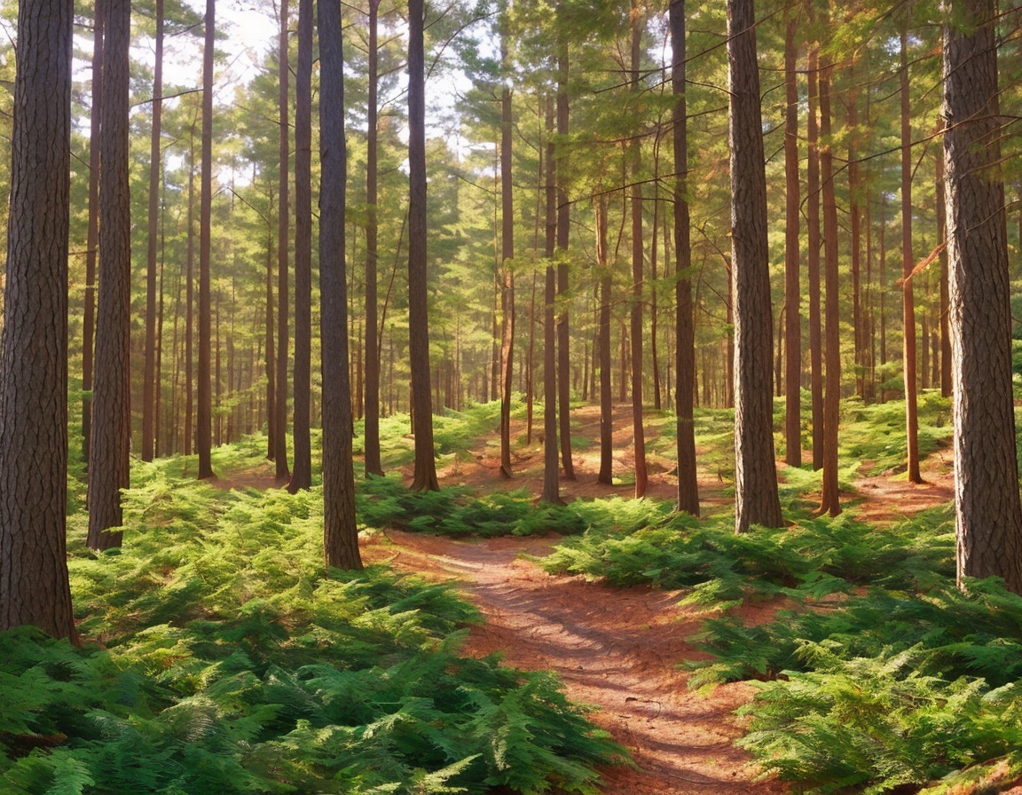 A serene forest path flanked by towering trees, with soft sunlight filtering through the foliage above, casting a warm glow.