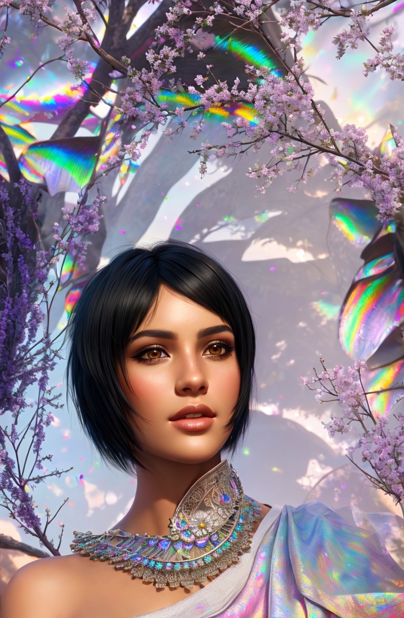 Digital artwork of woman with blue and purple hair, adorned with flowers, green eyes, and elaborate jewelry