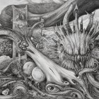 A surreal, monochromatic landscape features towering structures intertwined with organic forms, including a massive, tentacled creature. Two figures stand in awe amidst the eerie, otherworldly scenery.